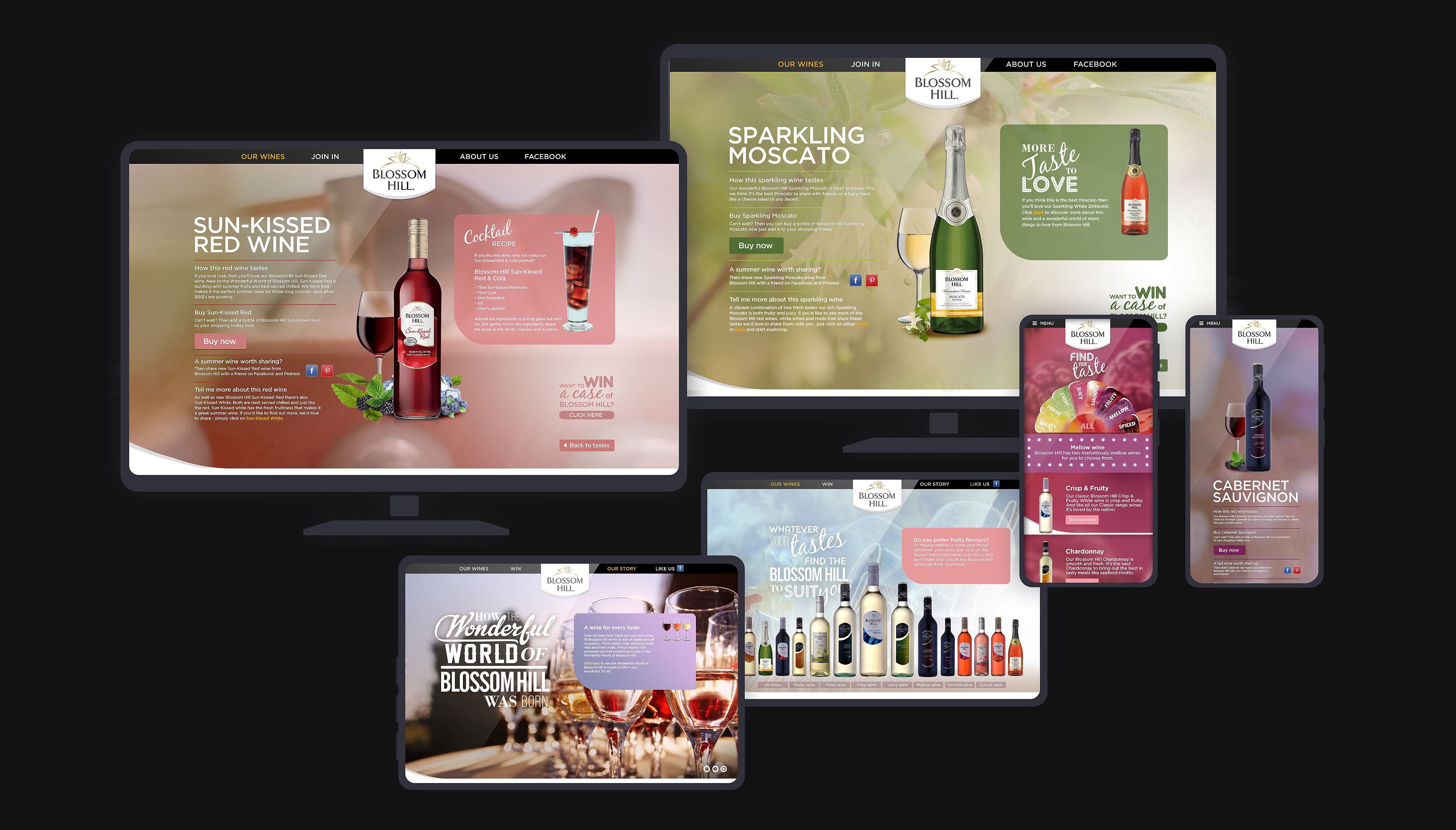 Creative and production of the Blossom Hill site. The idea was to match the wine variants to moods and social situations, to give wine recommendations that complimented not only each other but also with certain dishes.