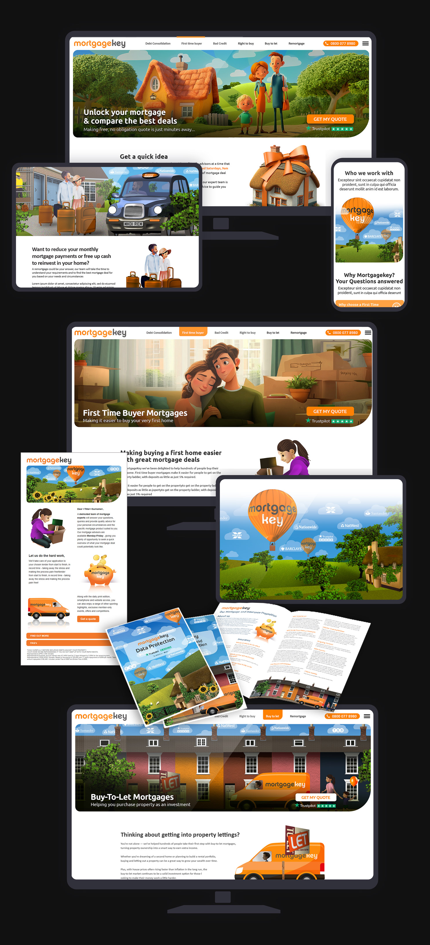 Full Corporate Identity, website design, illustrations, and all support digital and printed material for MortageKey mortgage brokers.