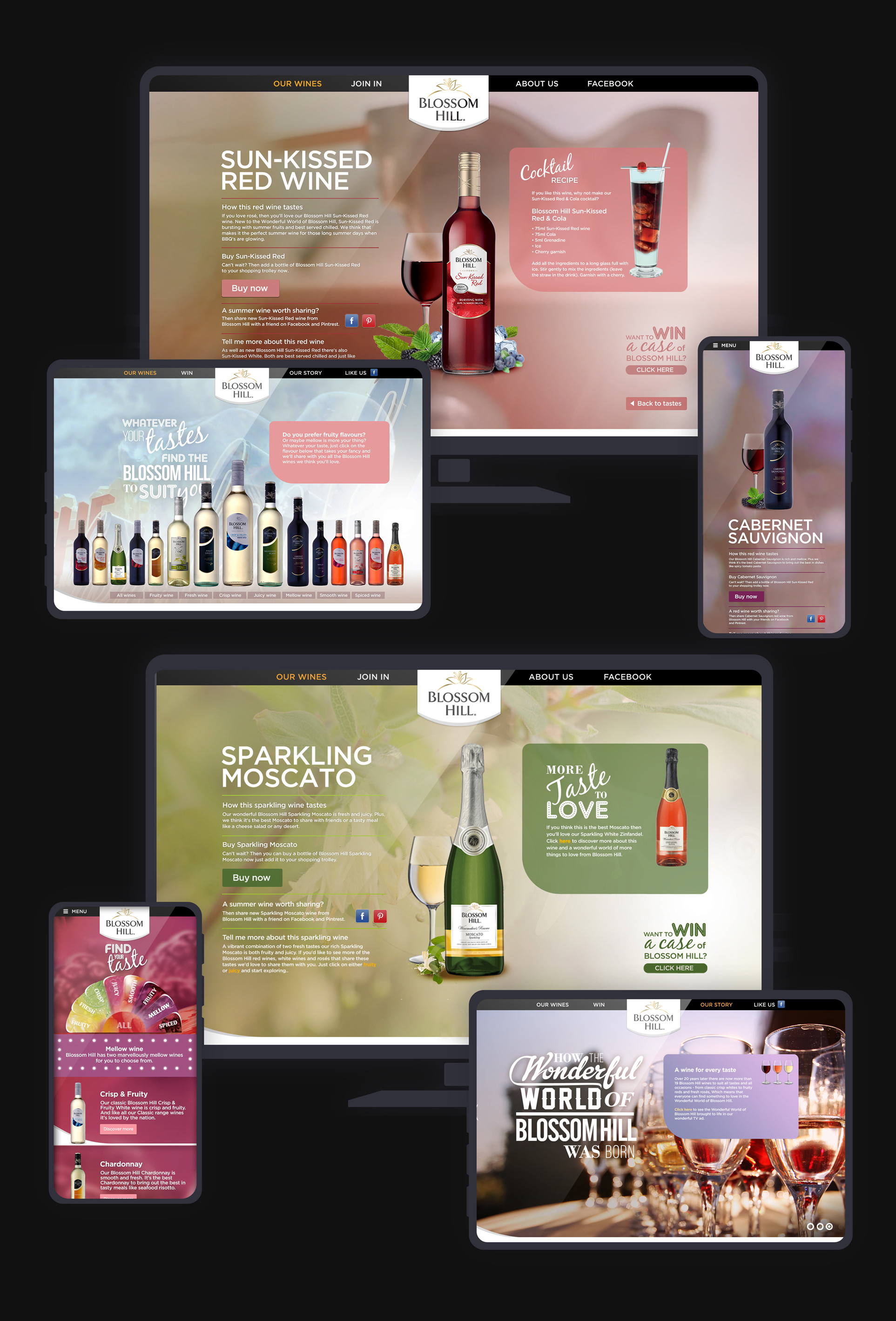 Creative and production of the Blossom Hill site. The idea was to match the wine variants to moods and social situations, to give wine recommendations that complimented not only each other but also with certain dishes.