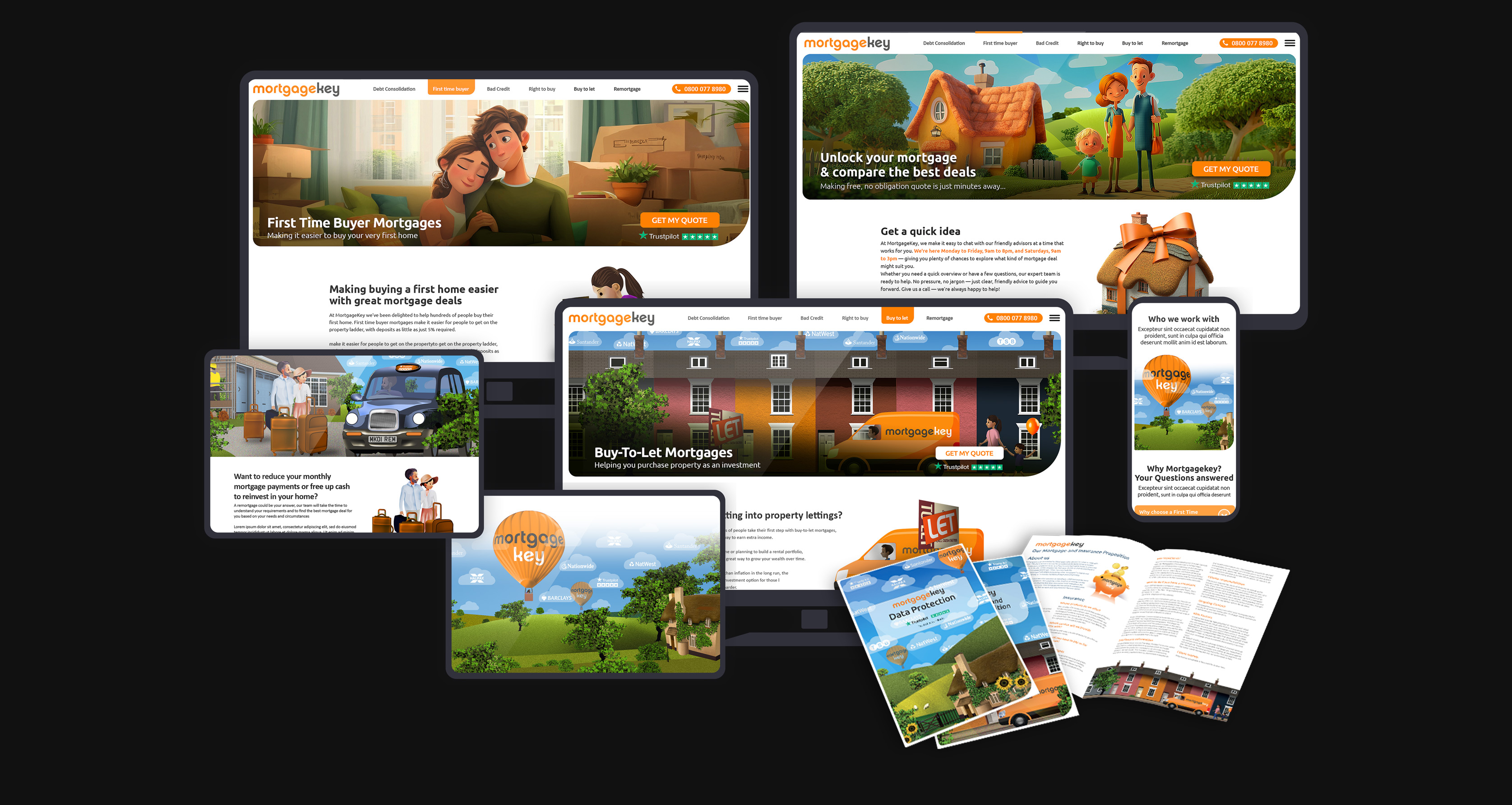 Full Corporate Identity, website design, illustrations, and all support digital and printed material for MortageKey mortgage brokers.